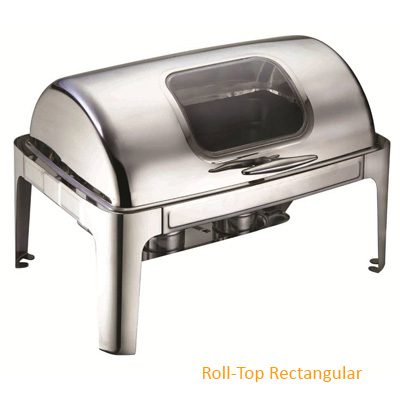 - Roll-Top Rectangular Chafing Dish - A roll-top lid with a rectangular food and water pan. The lid retracts and stays up. It includes a handle for the user to flip the lid open and lock it in place.