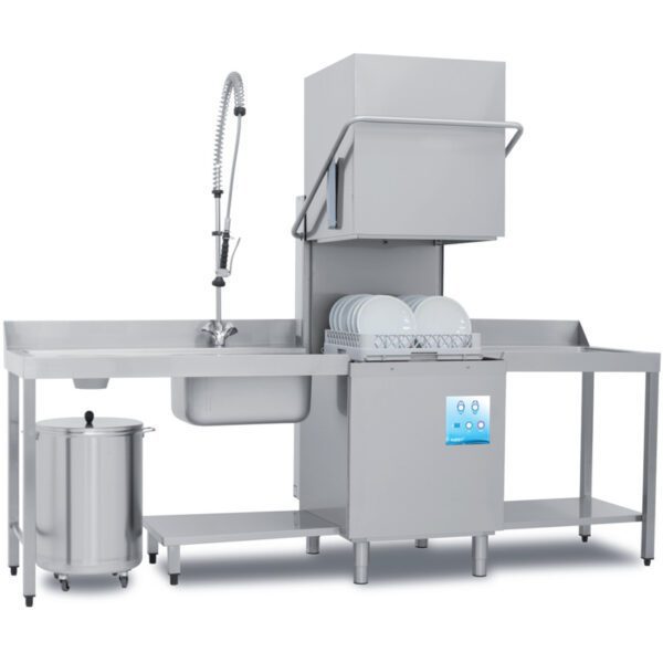 With the combination of a dirties table, inlet table, pre-rinse spray, and outlet table, the washing process of removing food scraps, rinsing dishes, washing, and drying is a slide along process – no lifting of loaded baskets is required.
